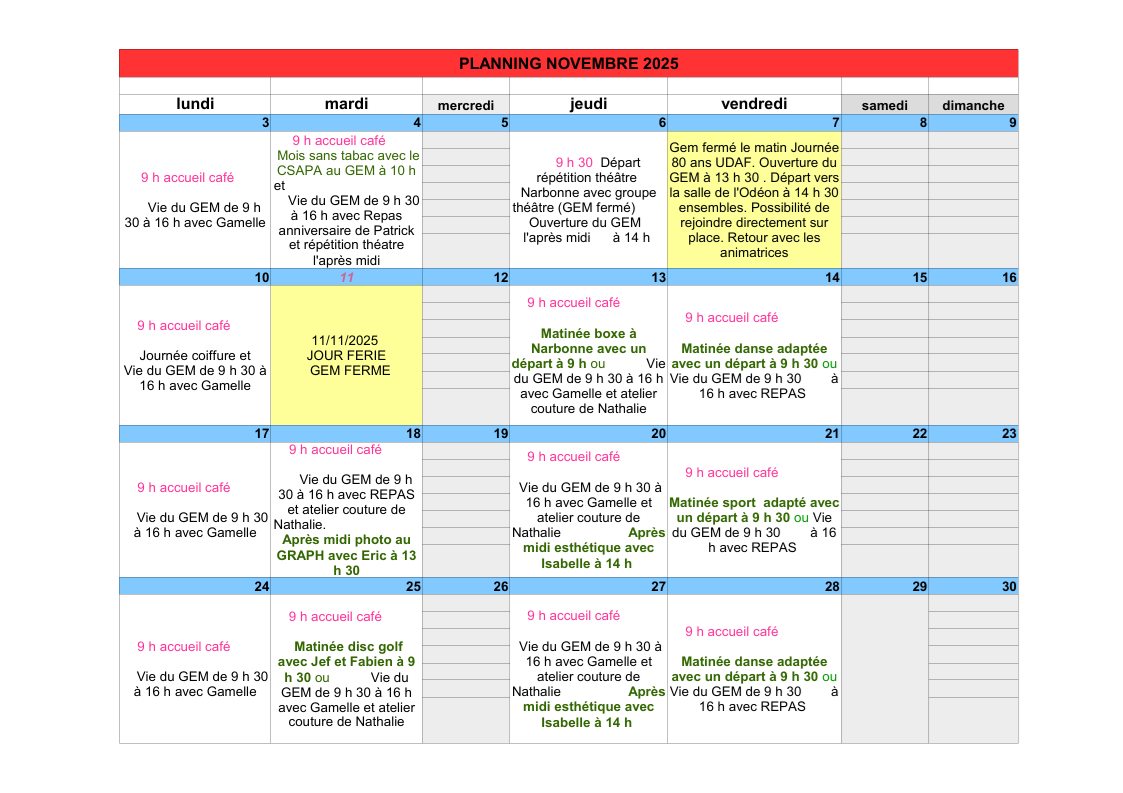 Les activités se passent durant les journées du lundi, mardi, jeudi et vendredi, ainsi que certains week-ends et mercredis. Elles sont choisies ensemble chaque mois, et chacun peut en proposer selon ses envies.Pour les sorties et repas, une inscription est obligatoire pour une question d’organisation et de prise de responsabilité.
